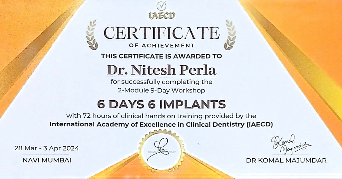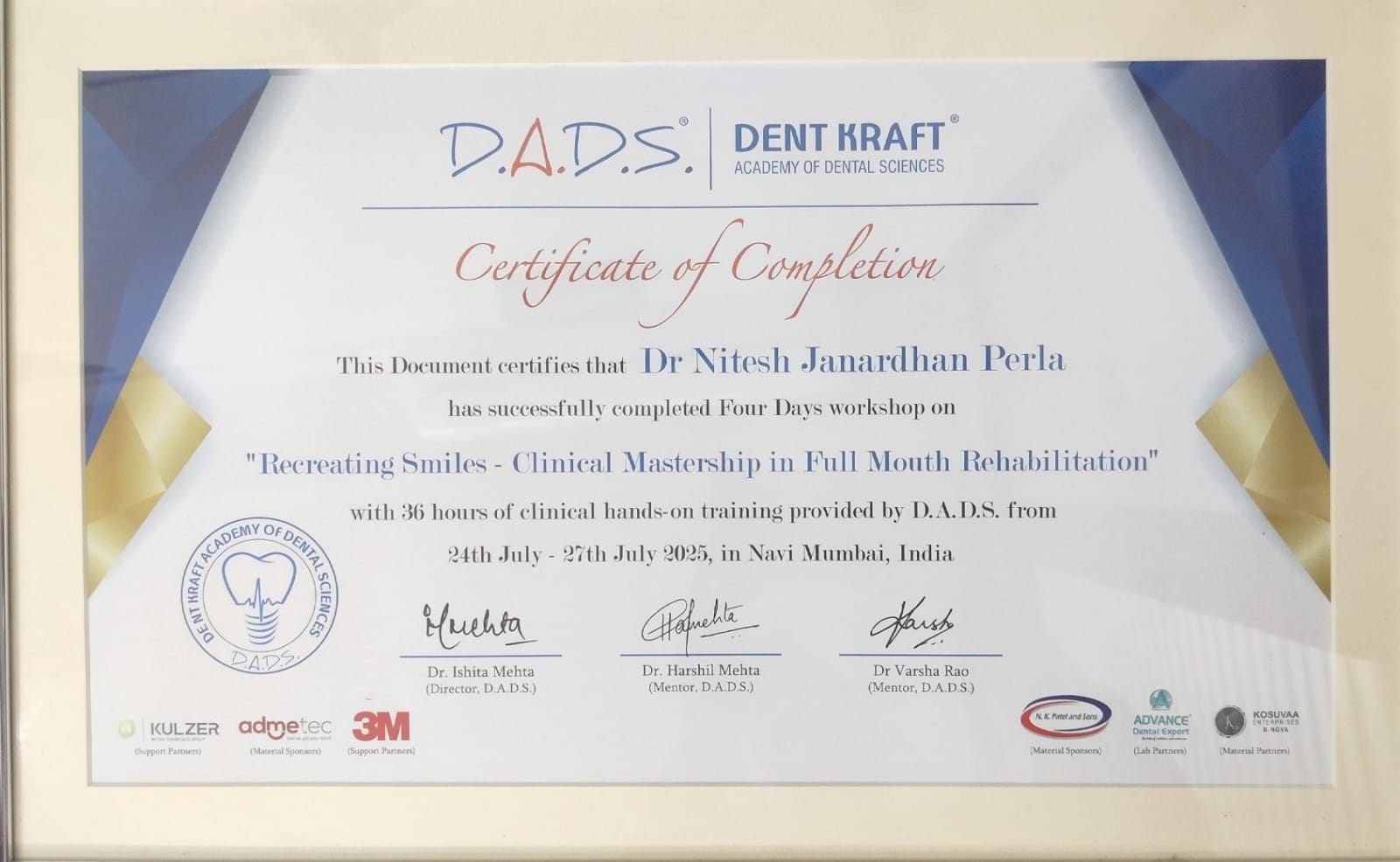 Over the years, Dr. Nitesh Perla has gained the confidence of thousands of patients with his genuine care, ethical practice, and consistent commitment to quality. Today, he is recognized as one of Palghar’s most reliable dental specialists, skilled in performing a wide range of treatments and procedures for various dental and oral health concerns.